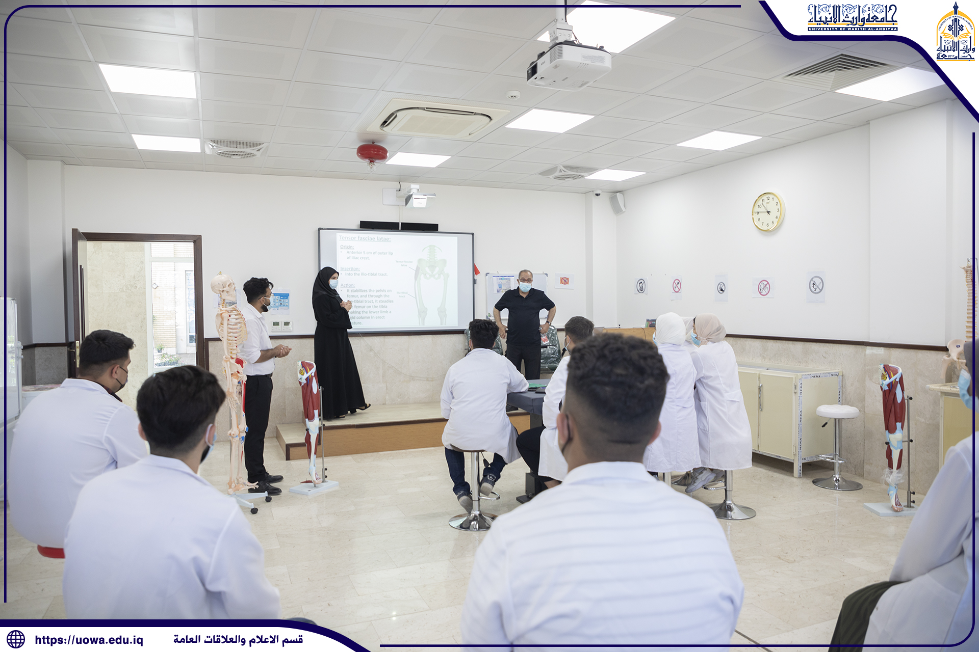 طلبة كلية الطب في جامعة وارث الأنبياء(عليه السلام) يتلقون محاضراتهم في المختبرات العلمية ، وأداء بعض التجارب الطبية المختبرية بإشراف مباشر من قبل عميد الكلية الأستاذ الدكتور فالح البياتي والسادة اعضاء هيئة التدريس ، حيث حرصت رئاسة الجامعة على توفير افضل المعدات والاجهزة المختبرية الحديثة للتدريس العملي في الكلية، مع التأكيد على الإلتزام بالاجراءات الوقائية الصحية وارتداء الكمامات للوقاية من عدوى الجائحة.
