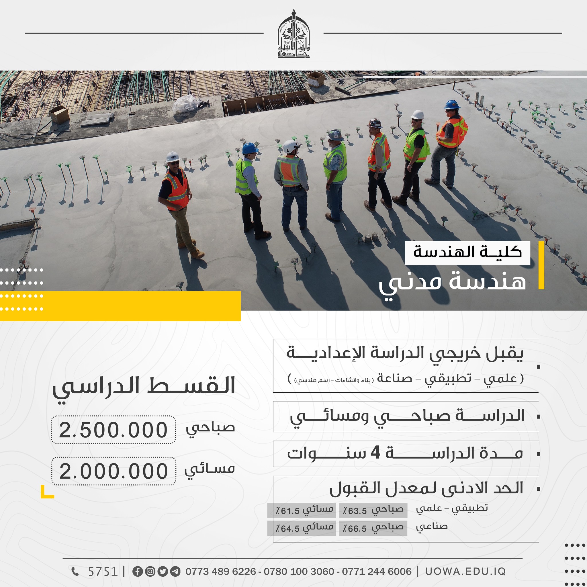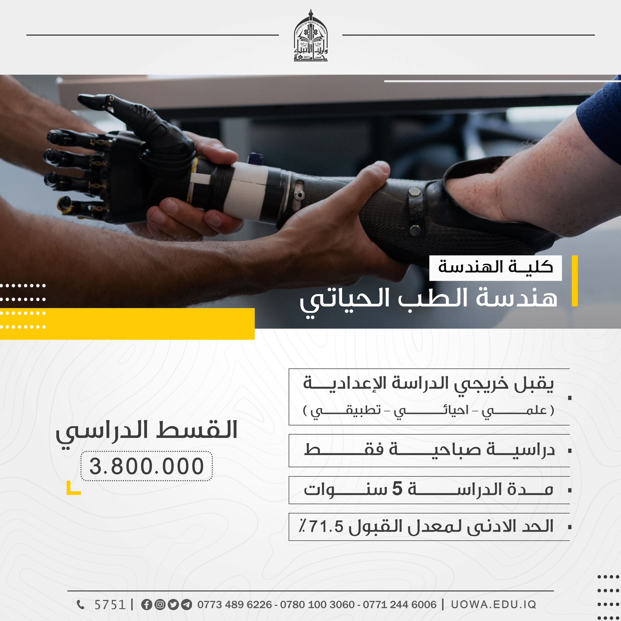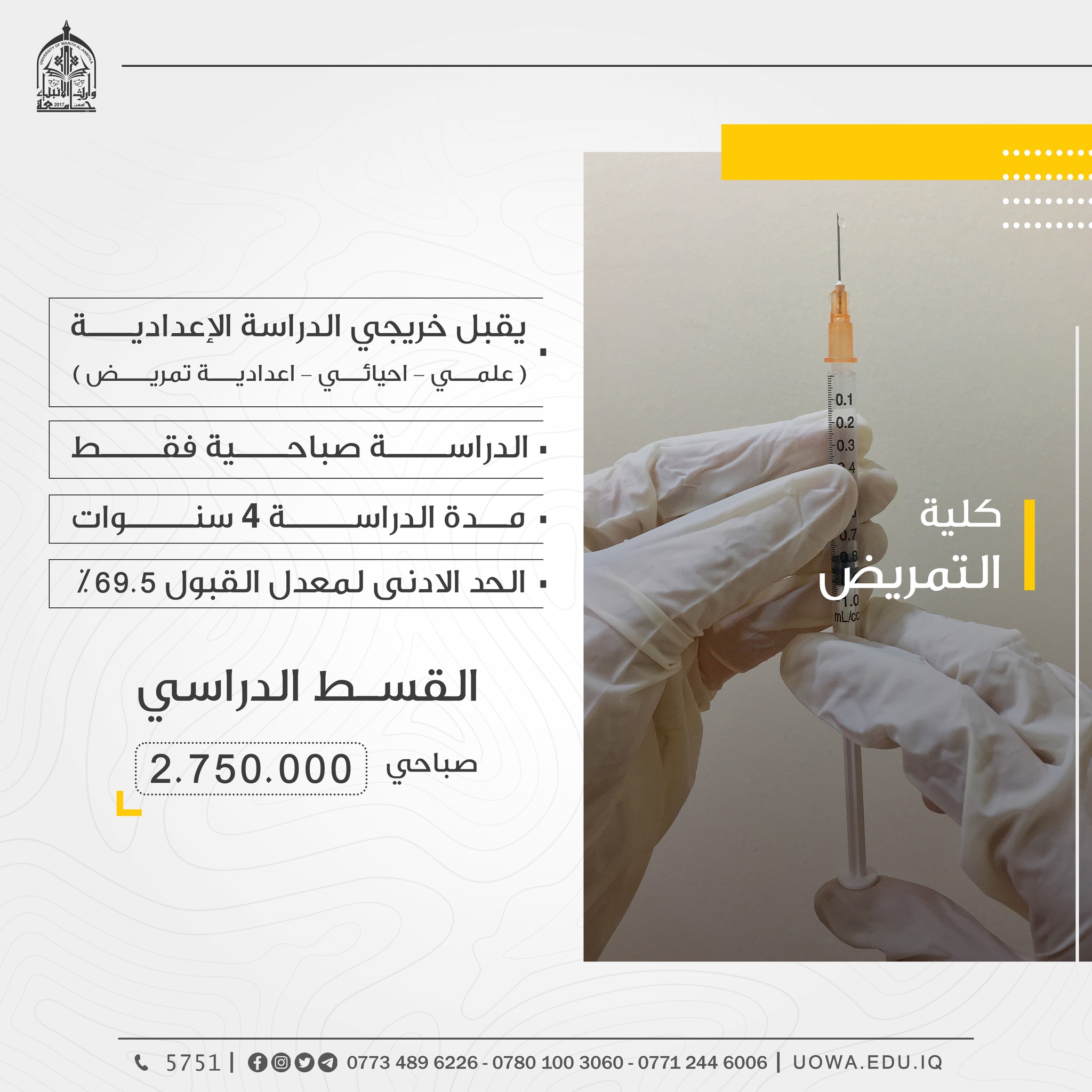 (عدا كلية الطب) اعزاءنا الطلبة الراغبين بالتسجيل في كليات واقسام جامعة وارث الانبياء(عليه السلام) (عدا كلية الطب) مراجعة الجامعة ابتداءً من السبت، إذ سيكون فريق التسجيل بانتظاركم من الساعة( ٨ ) صباحاً ولغاية( ٥ ) مساءً