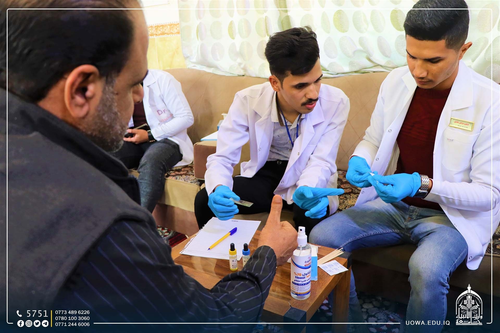 ضمن مبادرة "بركات الانوار المحمدية" التي اطلقتها هيئة الصحة والتعليم الجامعي في العتبة الحسينية المقدسة بمناسبة الولادات الشعبانية المباركة، اقامت كلية الطب بالتعاون مع كلية التمريض في جامعة وارث الانبياء(عليه السلام)، جولة ميدانية للقرى في اطراف محافظة كربلاء المقدسة بإشراف عمادة كلية الطب لتقديم الدعم الطبي لساكني هذه القرى و الاستشارات الطبية لهم.