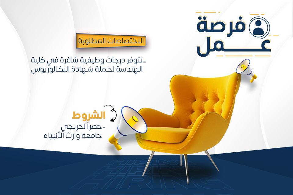 أعلنت جامعة وارث الأنبياء (عليه السلام)، عن توفر درجات وظيفية شاغرة في كلية الهندسة لحملة شهادة البكالوريوس، على أن تكون الفرص مخصصة حصراً لخريجي الجامعة.