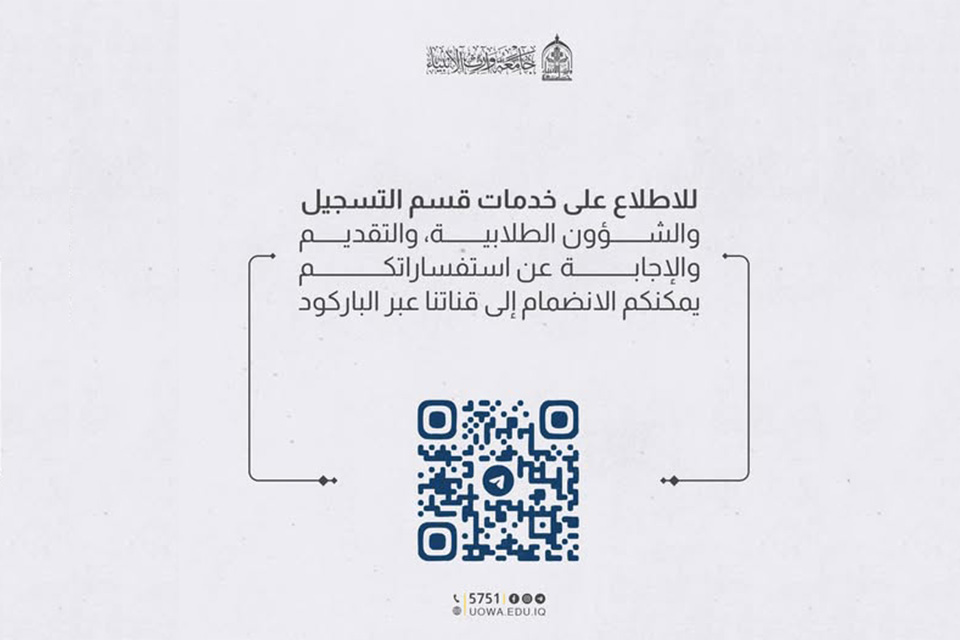حرصاً من جامعة وارث الأنبياء (عليه السلام) على خدمتكم وتوفير الإجابة عن جميع استفساراتكم المتعلقة بالتقديم، والقبول، والدراسة في كلياتها وأقسامها، ندعوكم للانضمام إلى قناة قسم التسجيل والشؤون الطلابية عن طريق الباركود المرفق او عبر الرابط أدناه