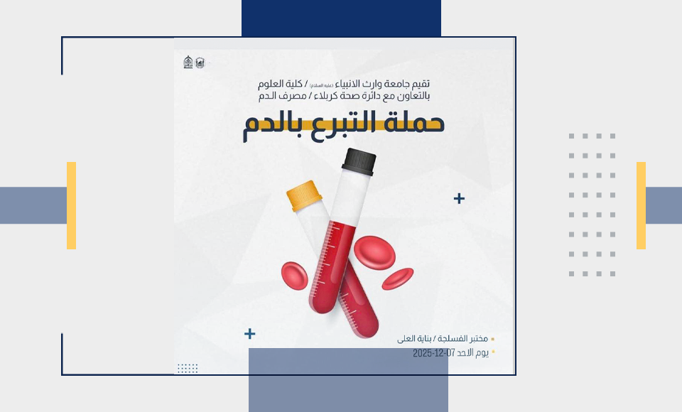 تقيم كلية العلوم في جامعة وارث الانبياء (عليه السلام) بالتعاون مع دائرة صحة كربلاء،حملة للتبرع بالدم في يوم الاحد الموافق 7/12/2025بناية العُلى / مختبر الفسلجة.والدعوة عامة للجميع