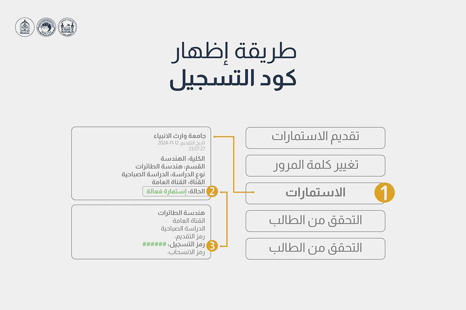الخطوة الثانية: ملء بيانات الطالب وتفعيل القنوات الخاصة (تُعلن قريباً) الخطوة الثالثة: التقديم على كليات وأقسام جامعة وارث الأنبياء وملء استمارة الاختيارات (تُعلن في حينها)