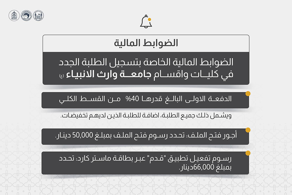 الضوابط المالية الخاصة بتسجيل الطلبة الجدد في كليات واقسام جامعة وارث الانبياء