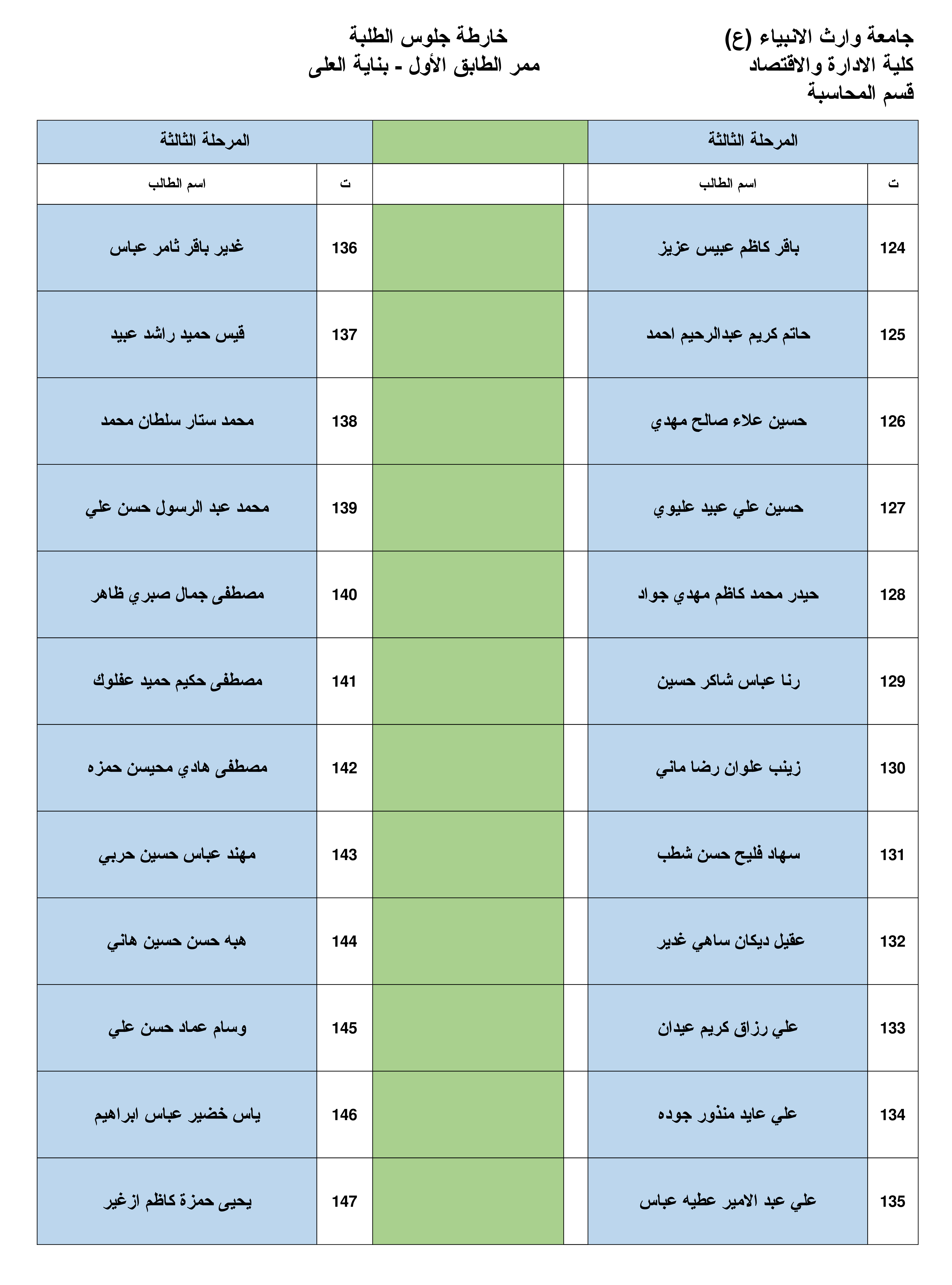نرفق لكم خارطة الجلوس في القاعات الامتحانية لقسم المحاسبة للمرحلة الأولى والثالثة وكما موضحة في أدناه