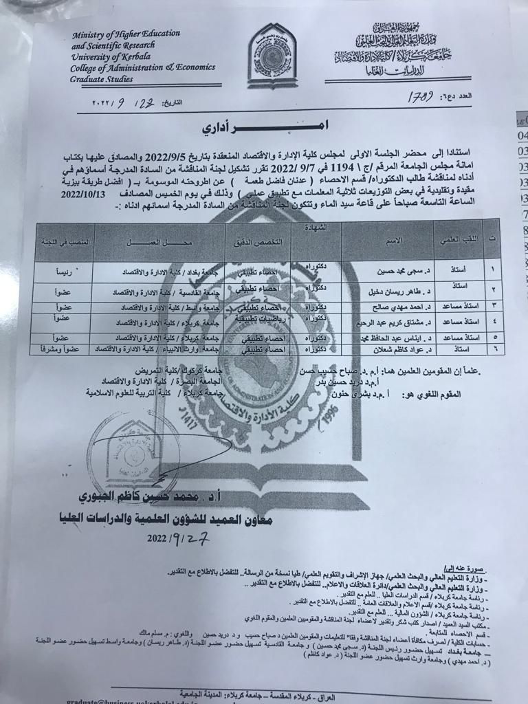 شارك الاستاذ الدكتور عواد كاظم الخالدي في عضويه ومناقشة اطروحة الدكتوراه للطالب عدنان فاضل طعمة لا طروحته الموسومة (افضل طريقة بيزية مقيدة وتقليدية في بعض التوزيعات ثلاثية المعلمات مع تطبيق عملي) وذلك في يوم الخميس المصادف ٠١٣/١٠/٢٠٢٢في جامعة كربلاء / كلية الإدارة والاقتصاد / قسم الاحصاء.اذا تألفت لجنة المناقشة من السادة الافاضل :أ.د.سجى محمد حسين / رئيساأ.د.طاهر ريسان دخيل / عضواأ.م د.احمد مهدي صالح / عضواا.م.د. مشتاق كريم عبد الرحيم / عضوا أ.د.عواد كاظم الخالدي / عضوا ومشرفاوبعد مناقشة مستفيضة تم منح شهادة الدكتوراة ..فكل التوفيق والسداد للباحث والمشرف وللجنة المناقشه