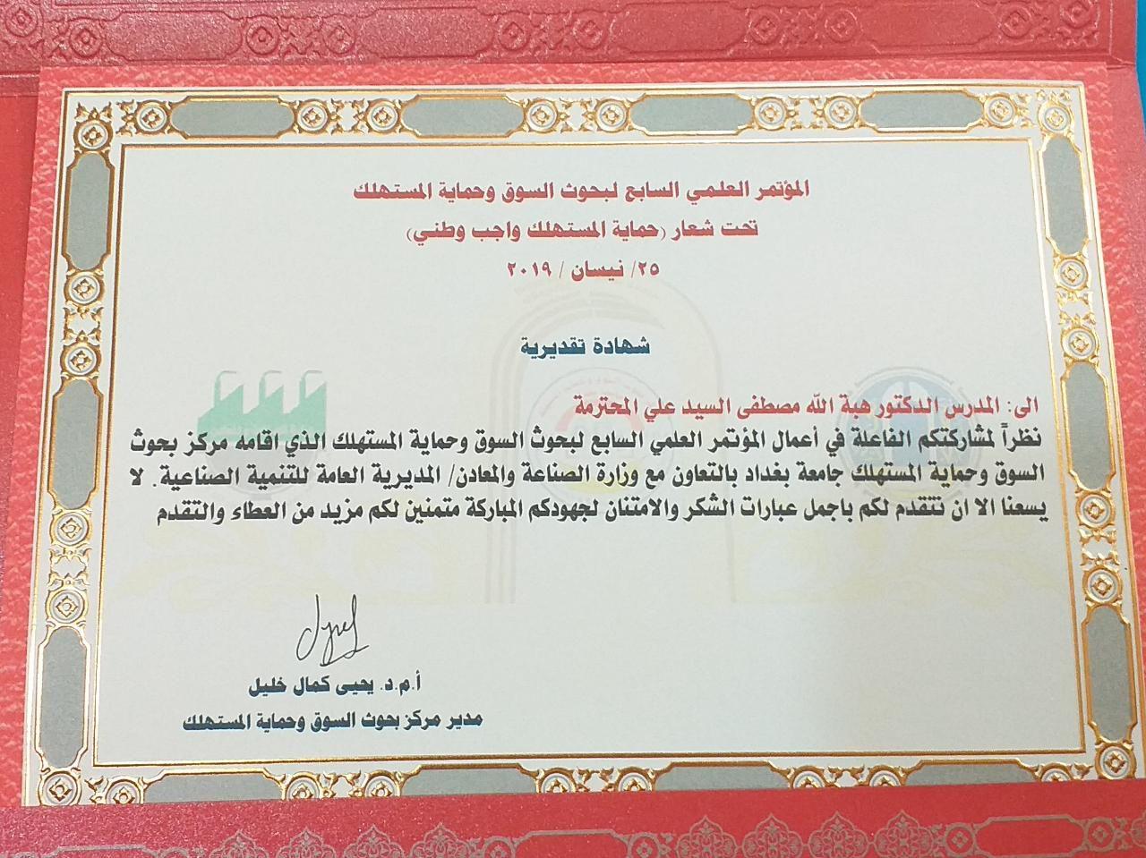 شاركت الدكتورة هبة الله مصطفى السيد علي التدريسية في قسم المحاسبة /كلية الادارة والاقتصاد / جامعة وارث الانبياء في المؤتمر العلمي السابع (لبحوث السوق وحماية المستهلك) والذي انعقد في جامعة بغداد (25) نيسان 2019 , وحصلت الدكتورة هبة الله مصطفى على درع للمشاركة الفعالة و شهادة تقديرية وشهادة مشاركة من مركز بحوث السوق وحماية المستهلك/ جامعة بغداد  وذلك لمشاركتها المتميزة في القاء بحث بعنوان ((تسخير الرقمنة لتحقيق اهداف التنمية المستدامة 2030  , تجربة امارة دبي))