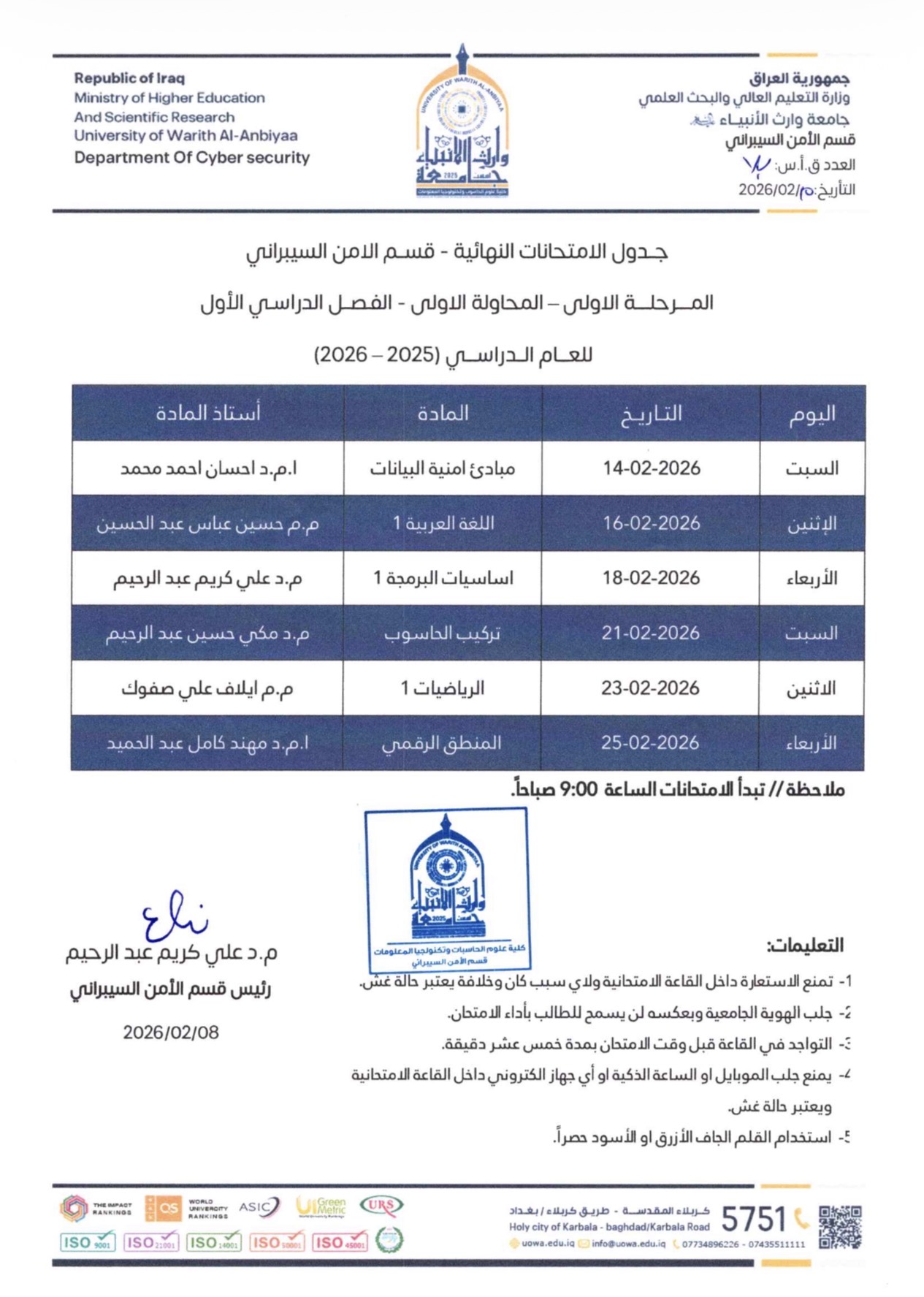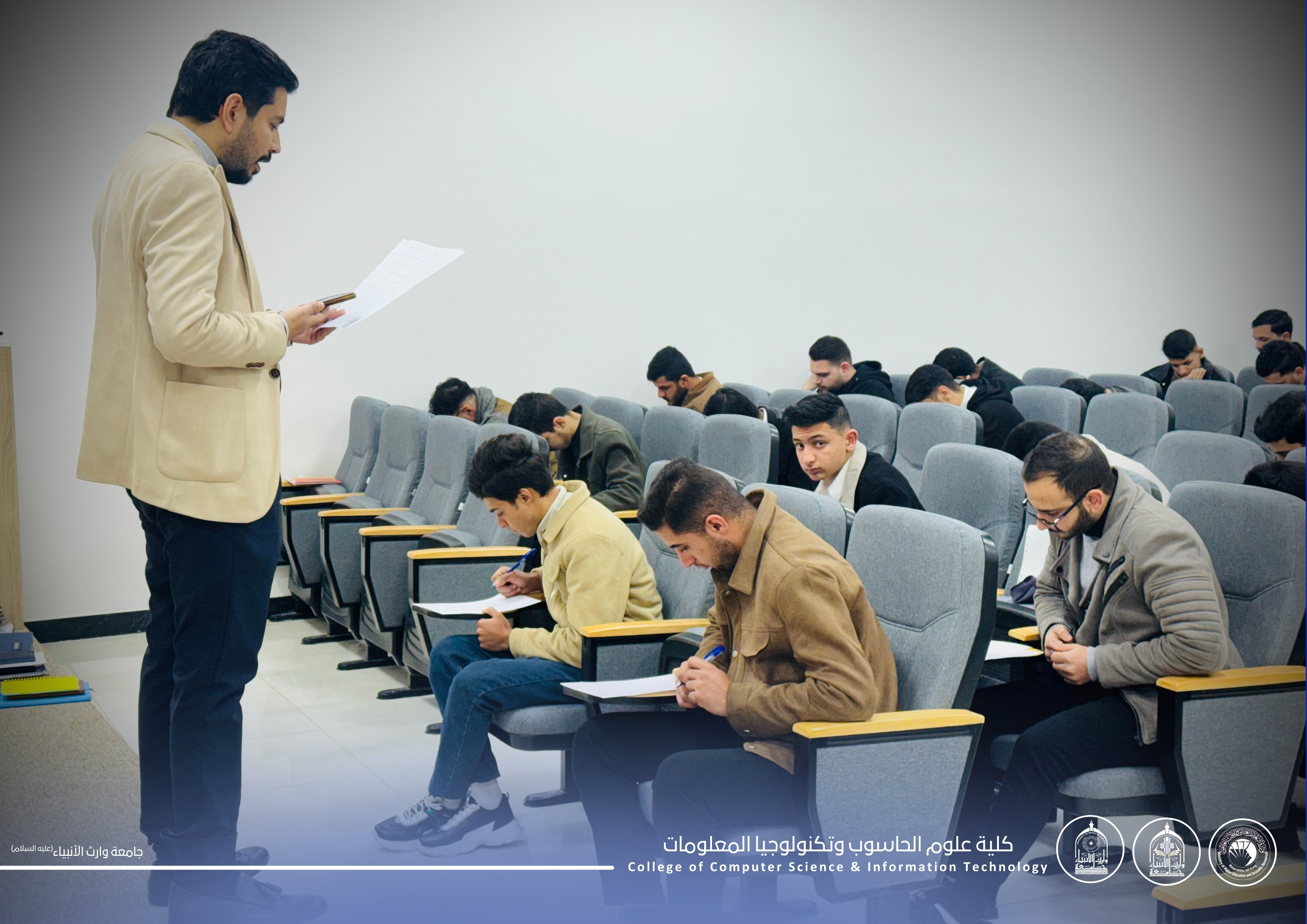 اطّلع مساعد رئيس الجامعة للشؤون العلمية الأستاذ الدكتور واقد الموسوي، يرافقه الأستاذ المساعد الدكتور حيدر محمد علي الغانمي عميد كلية علوم الحاسوب وتكنولوجيا المعلومات، على سير الامتحانات النهائية لطلبة المرحلة الأولى.