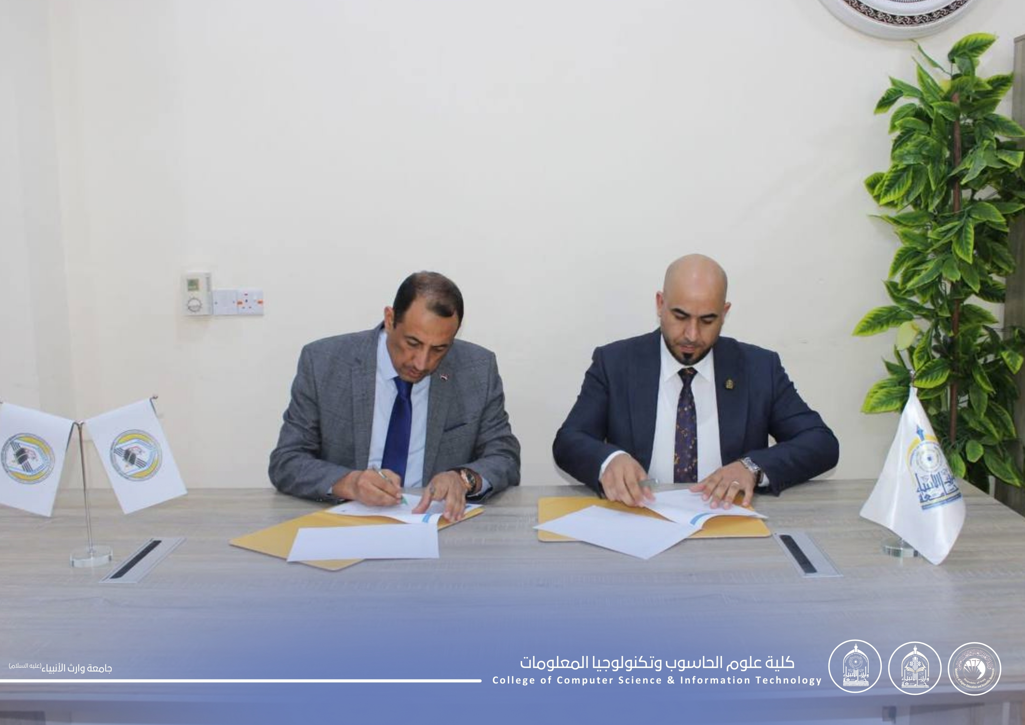 توقيع اتفاقية توأمة علمية بين كلية علوم الحاسوب وتكنولوجيا المعلومات في جامعة وارث الانبياء عليه السلام وجامعة كربلاء لتعزيز التعاون الأكاديمي.