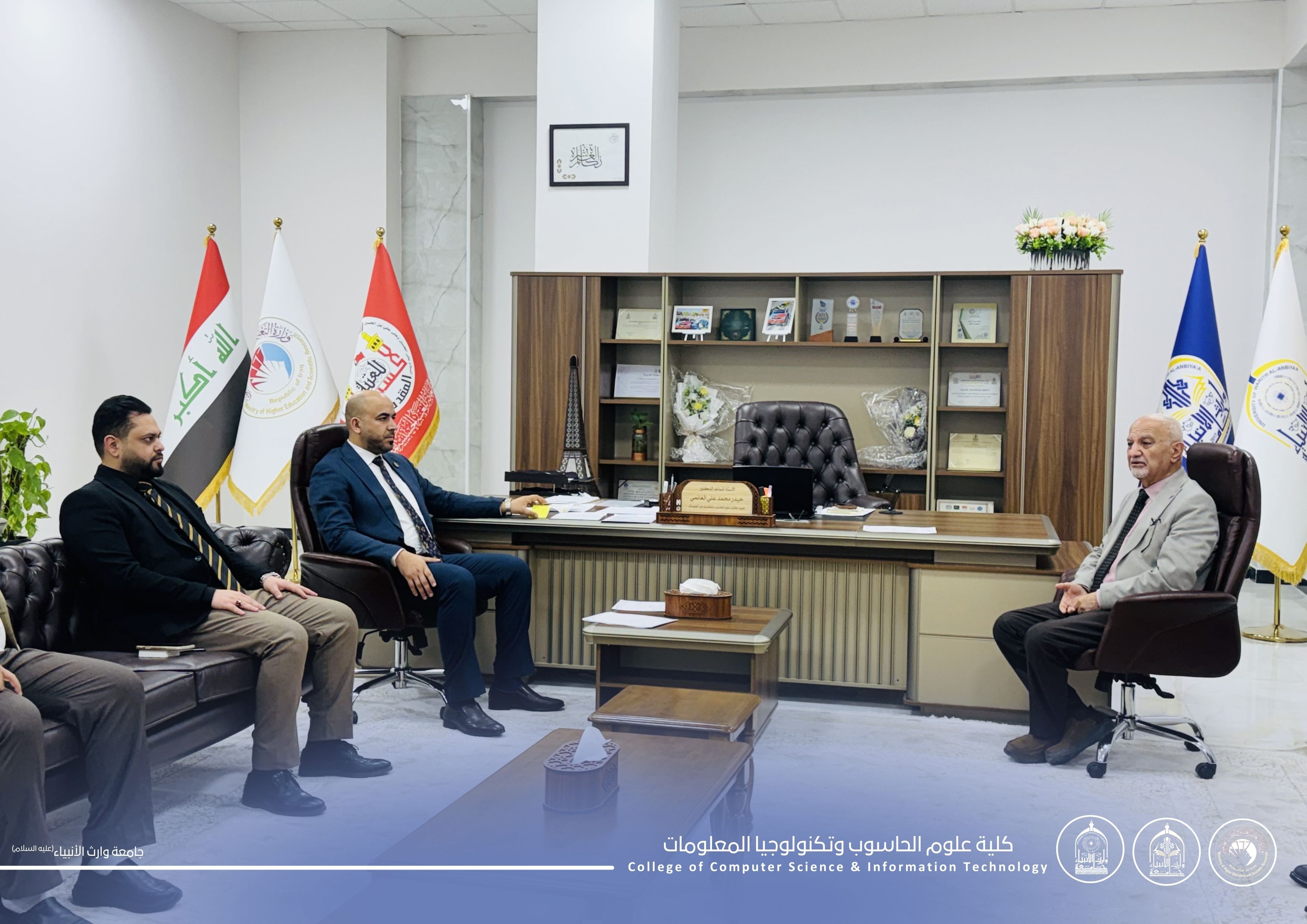 استقبل السيد عميد كلية علوم الحاسوب وتكنولوجيا المعلومات، الأستاذ المساعد الدكتور حيدر محمد علي الغانمي، وفداً رفيع المستوى من كلية الهندسة - جامعة وارث الانبياء- برئاسة السيد العميد الأستاذ المساعد الدكتور حسين هادي حسين، يرافقه نخبة من أساتذة الكلية.
