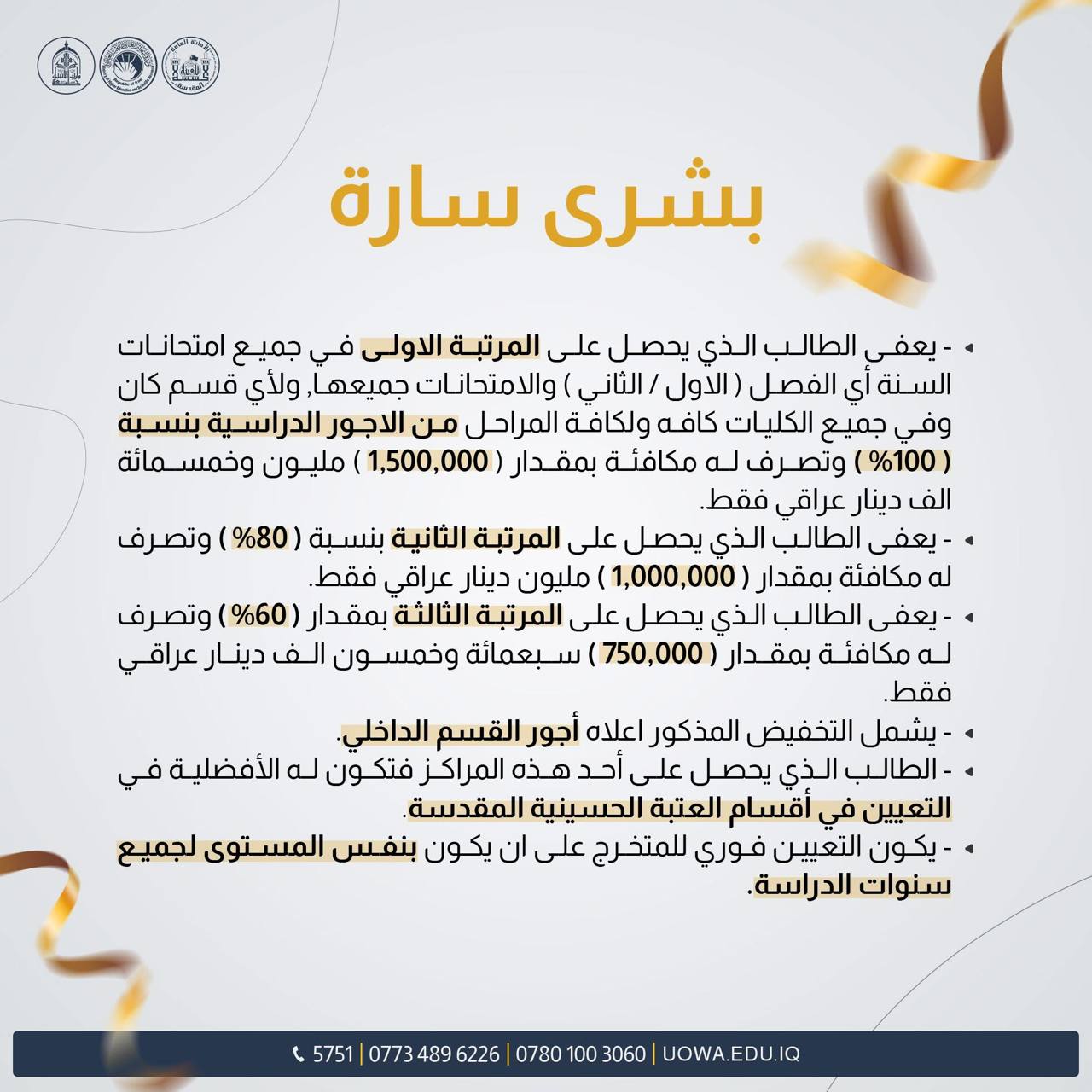 تسعى كلية القانون وجامعة وارث الأنبياء (عليه السلام) إلى تقديم كل الدعم الممكن للطلاب من خلال توفير بيئة تعليمية متميزة ومحفزة. يشمل الدعم المادي و الأكاديمي وتقديم الموارد التعليمية المتنوعة، بالإضافة إلى تسهيل الوصول إلى الأنشطة البحثية والفرص العملية التي تنمي مهارات الطلاب