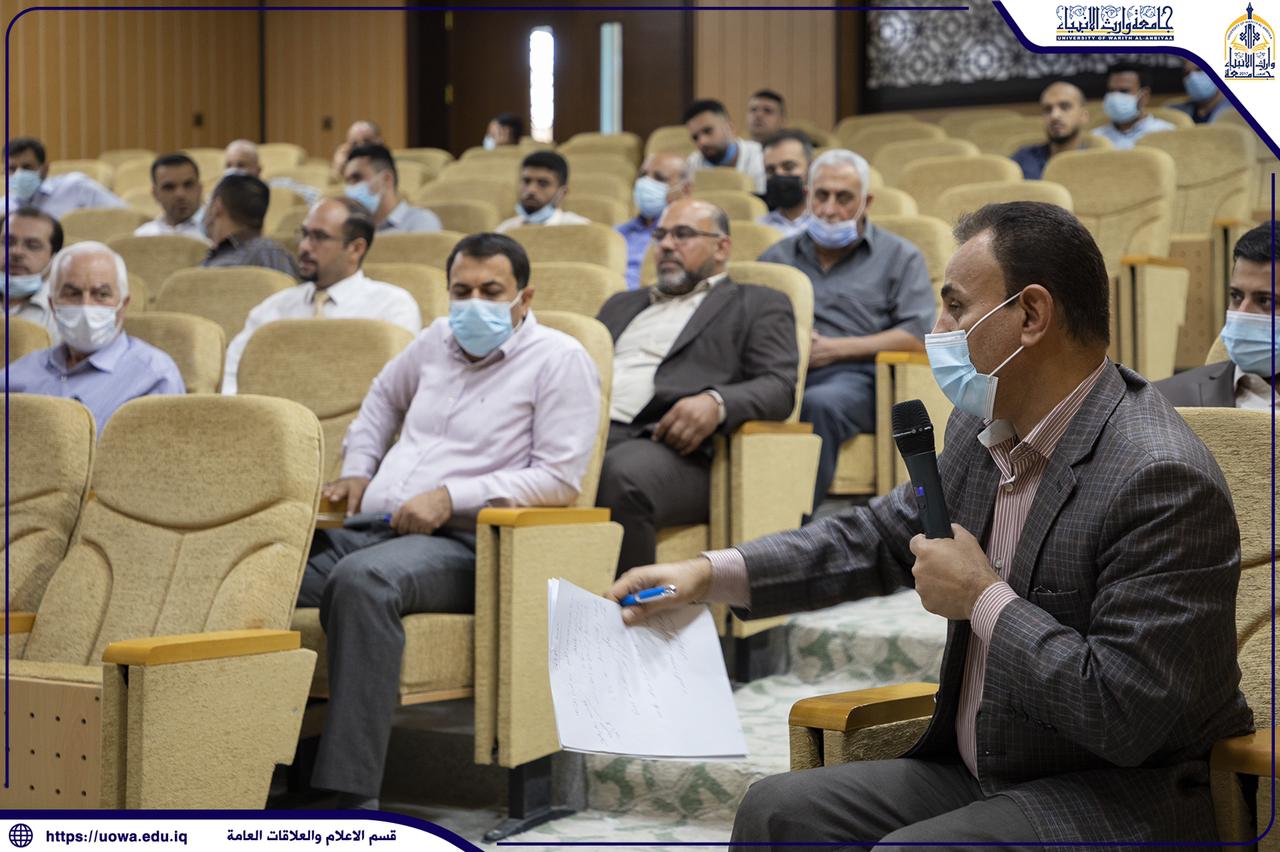 ناقش فيه السيد عميد الكلية المحترم استمارات البرنامج الحكومي المرسل من قبل وزارة التعليم العالي والبحث العلمي حيث أكد السيد عميد الكلية المحترم بضرورة تنفيذ الأنشطة العلمية المشار إليها في استمارات البرنامج الحكومي من دورات وادوات ومؤتمرات و ورش علمية.
