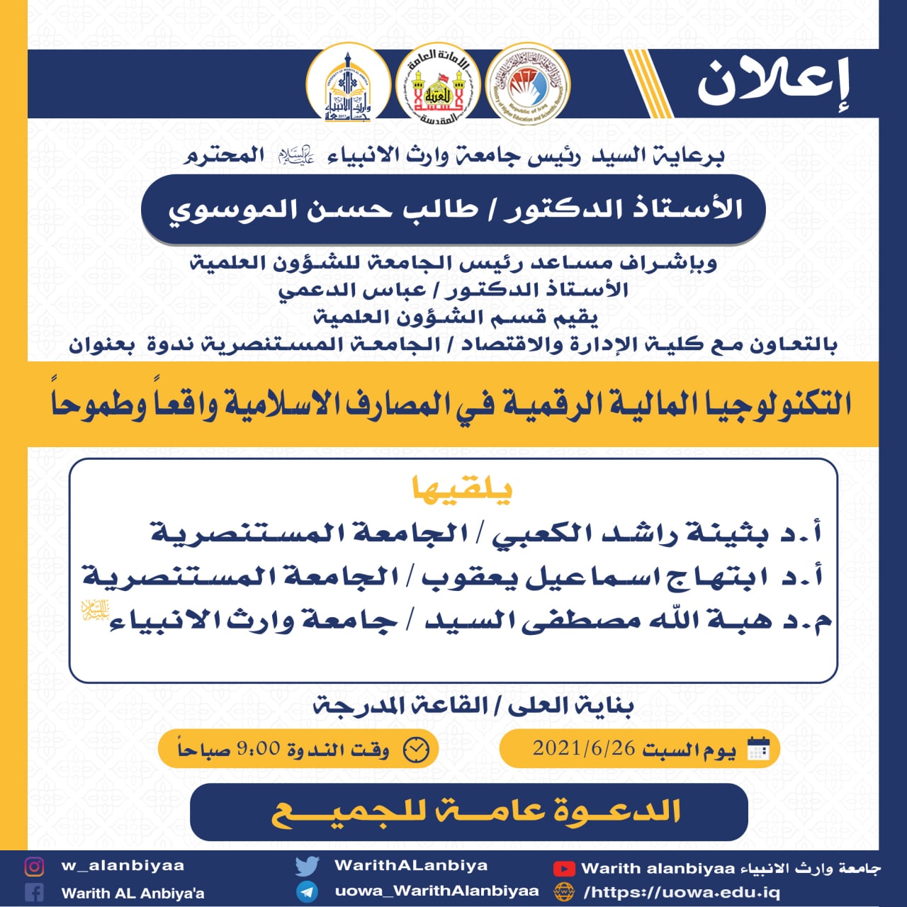 يطل علينا هذا الاسبوع الدكتور مصطفى الابراهيمي ليتحفنا بمعلومات قيمة عن كيفية الشروع في البحث العلمي في محاضرة بعنوان ( خطوات البحث العلمي ) وستكون يوم الخميس المصادف ٢٤/٦/٢٠٢١ في تمام الساعة التاسعة مساء راجين من اعزائنا الطلبة الحضور والاستفادة من المحاضرة