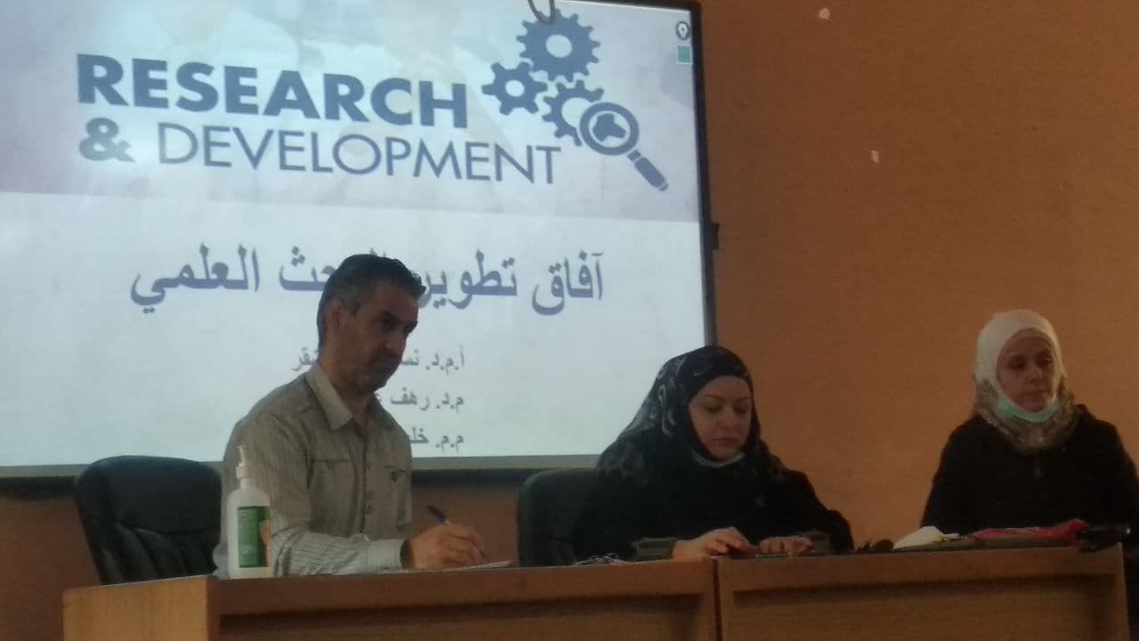القى رئيس فرع اساسيات التمريض الاستاذ المساعد الدكتور نسيم صقر وبالمشاركة مع المدرس رهف عقل رجوب  والمدرس المساعد خلود هاشم سلوم ندوة علمية حول افاق تطوير البحث العلمي وبحضور تدريسي كلية التمريض