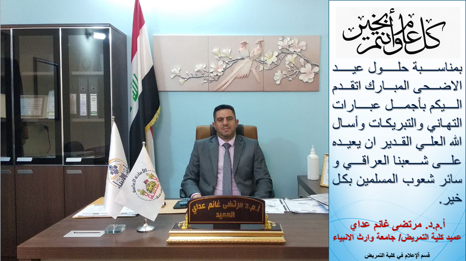 تتقدم عمادة كلية التمريض المتمثلة بالاستاذ المساعد الدكتور مرتضى غانم الجبوري عميد الكلية والملاك التدريسي والفني بالتهنئة الخالصة الى الامة الاسلامية بمناسبة عيد الاضحى المبارك