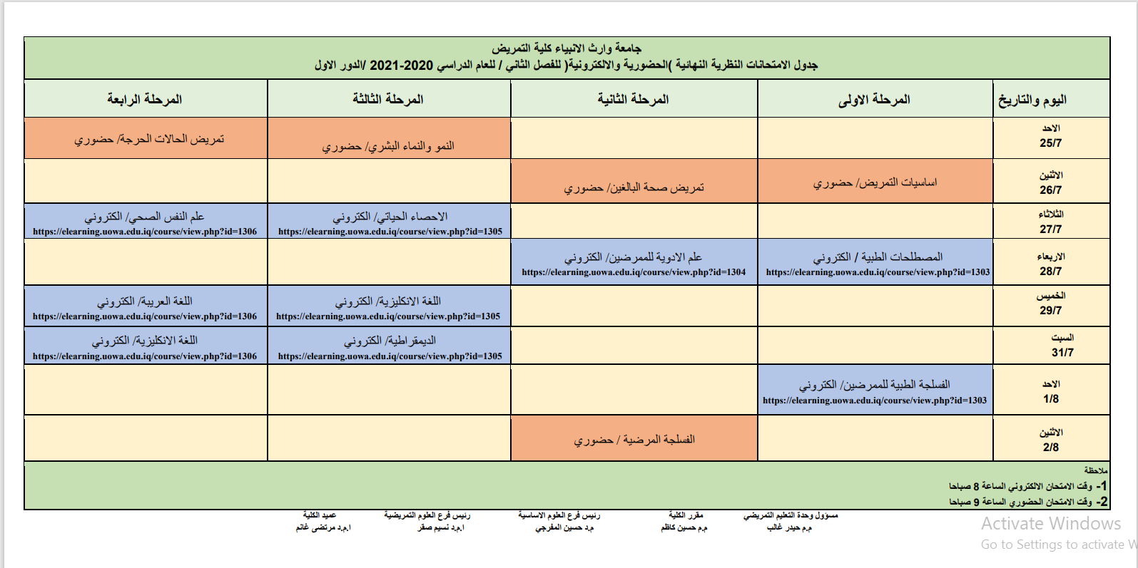 جدول الامتحانات النهائية للمراحل الاولى, الثانية , الثالثة والرابعة (الحضورية و الالكترونية )