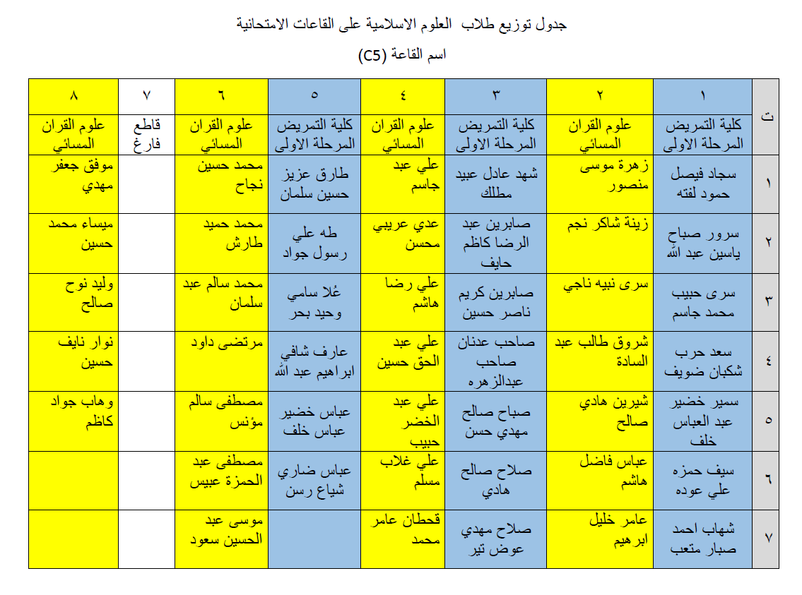 جداول توزيع طلبة كلية التمريض وكلية العلوم الاسلامية على القاعات الامتحانية لامتحانات نهاية الكورس الاول للعام الدراسي 2018/2019.