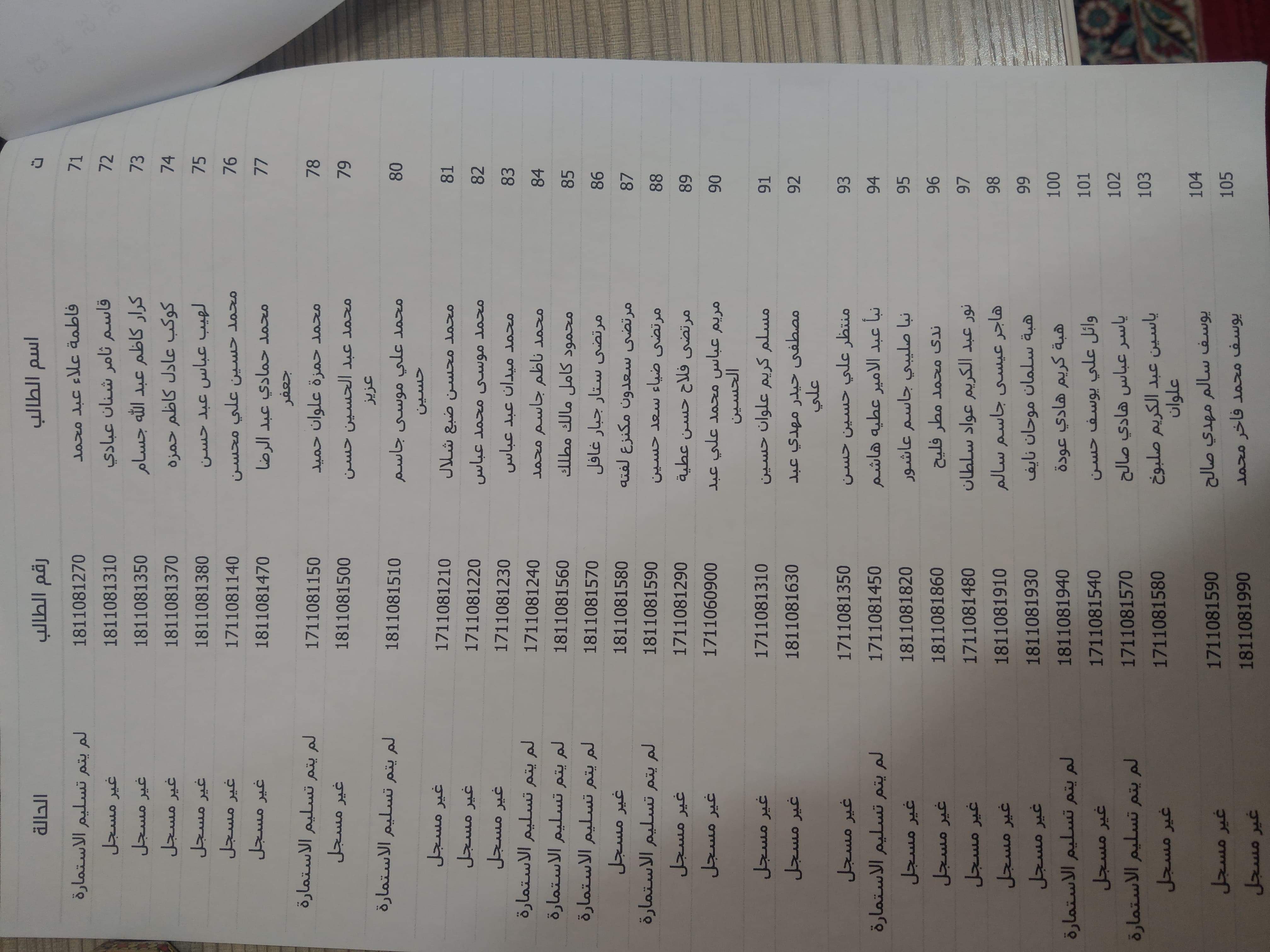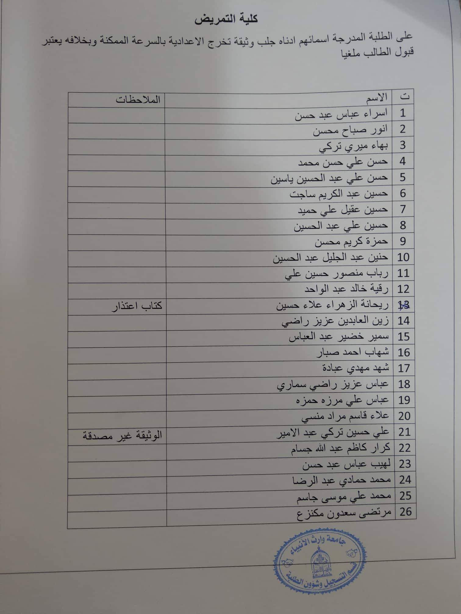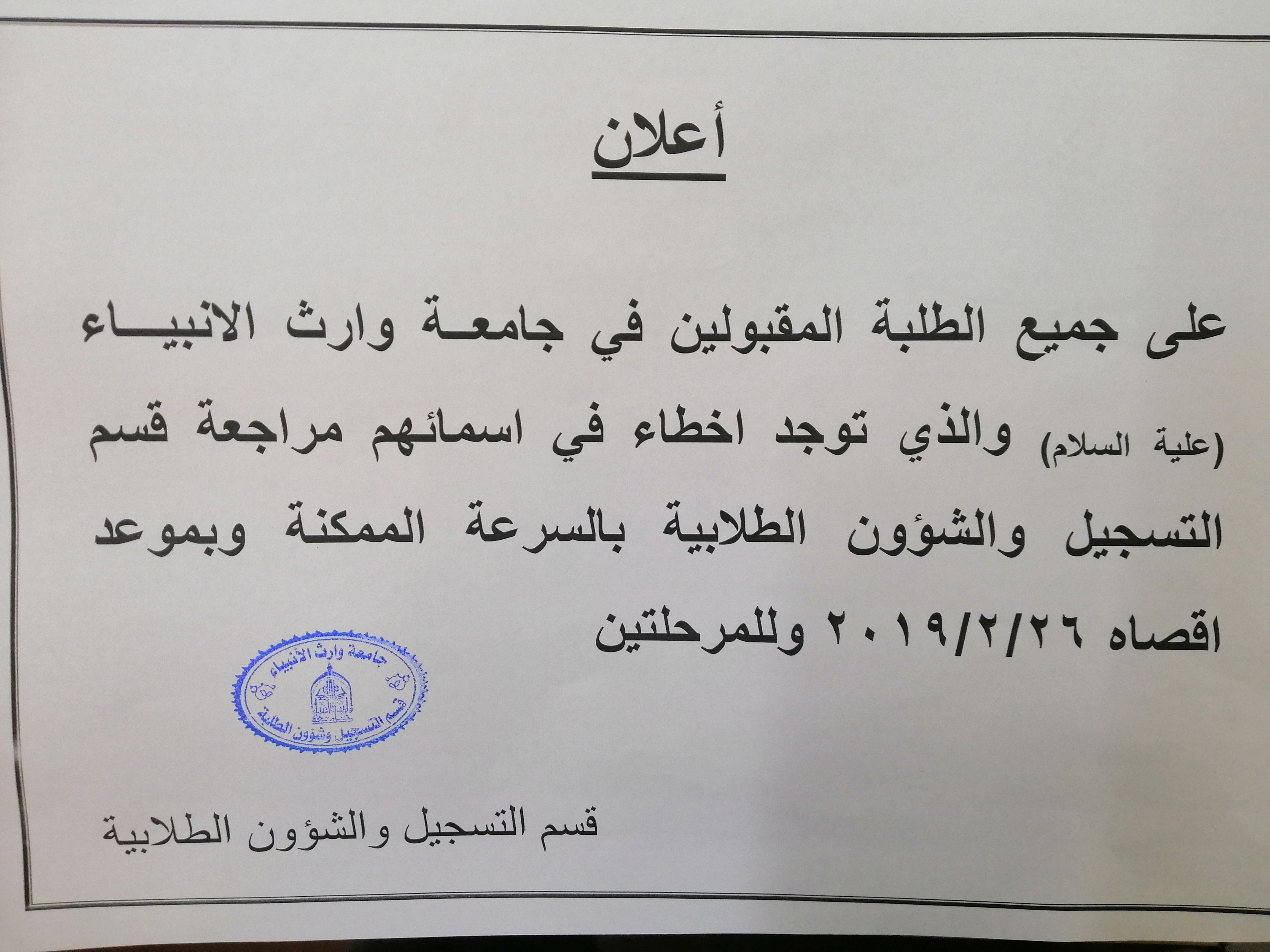 على طلبة المرحلتين الذين توجد اخطاء في اسمائهم مراجعة قسم التسجيل بالسرعة الممكنة لغرض تعديل اسمائهم وبموعد اقصاه ٢٠١٩/٢/٢٦ وحسب الكتاب المبين اعلاه.