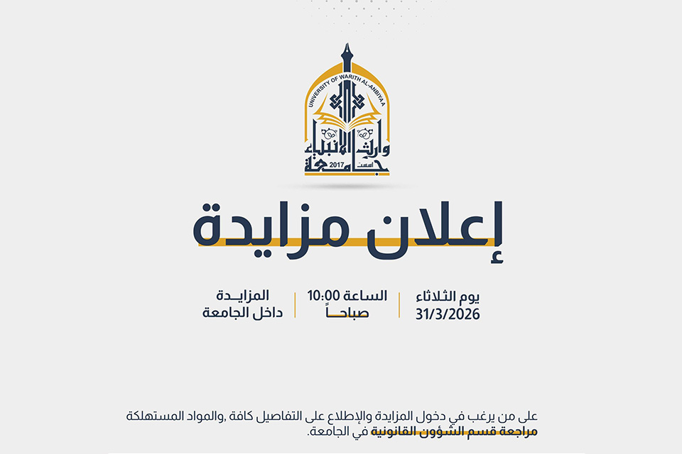 تعلن جامعة وارث الأنبياء (عليه السلام)عن إقامة مزايدة داخل الحرم الجامعي لمواد مستهلكة وذلك يوم الثلاثاء الموافق 31/3/2026 في تمام الساعة 10:00 صباحاً.ندعو الراغبين بالمشاركة إلى الاطلاع على كافة التفاصيل والشروط، التوجه إلى قسم الشؤون القانونية في الجامعة لإكمال الإجراءات المطلوبة.