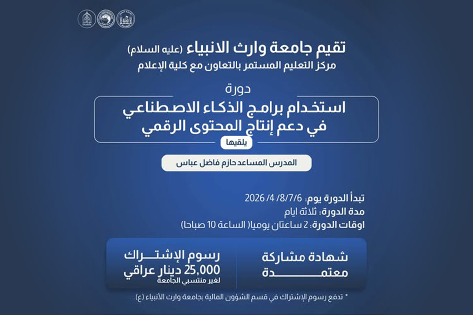 تعلن جامعة وارث الأنبياء (ع) عن إقامة دورة تدريبية في دعم إنتاج المحتوى الرقمي
