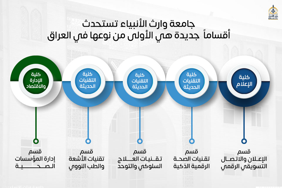 أعلنت جامعة وارث الأنبياء (عليه السلام) عن استحداث خمسة أقسام علمية جديدة تُعد الأولى من نوعها على مستوى العراق، وذلك بعد استحصال الموافقات الرسمية من وزارة التعليم العالي والبحث العلمي.