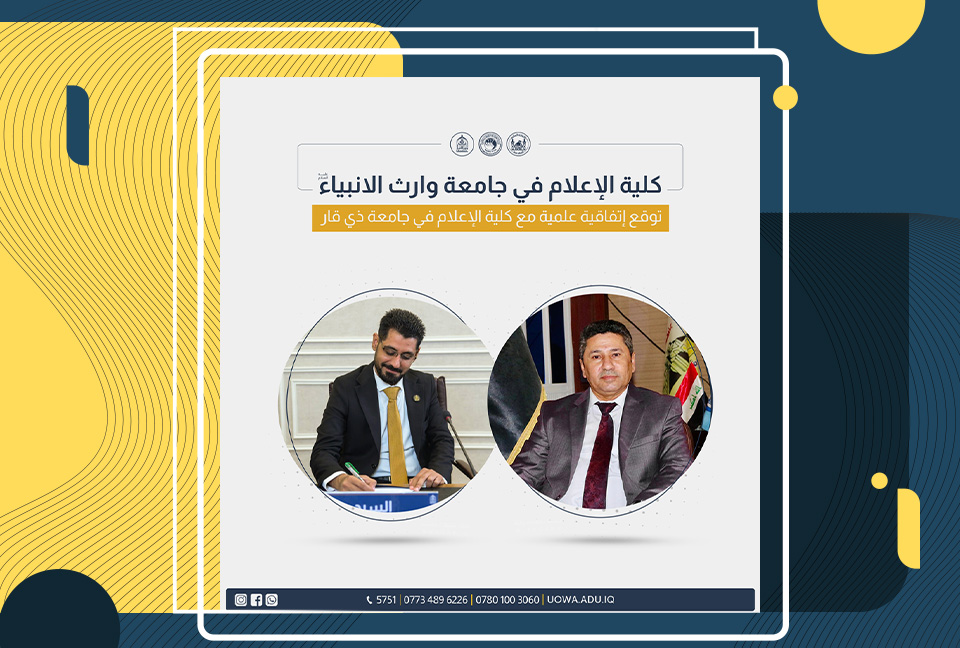 وقَّع عميد كلية الإعلام في جامعة وارث الأنبياء (عليه السلام)، الدكتور محمد جمال حسين اتفاقية علمية مع عميد كلية الإعلام في جامعة ذي قار، الأستاذ الدكتور هادي فليح حسن.