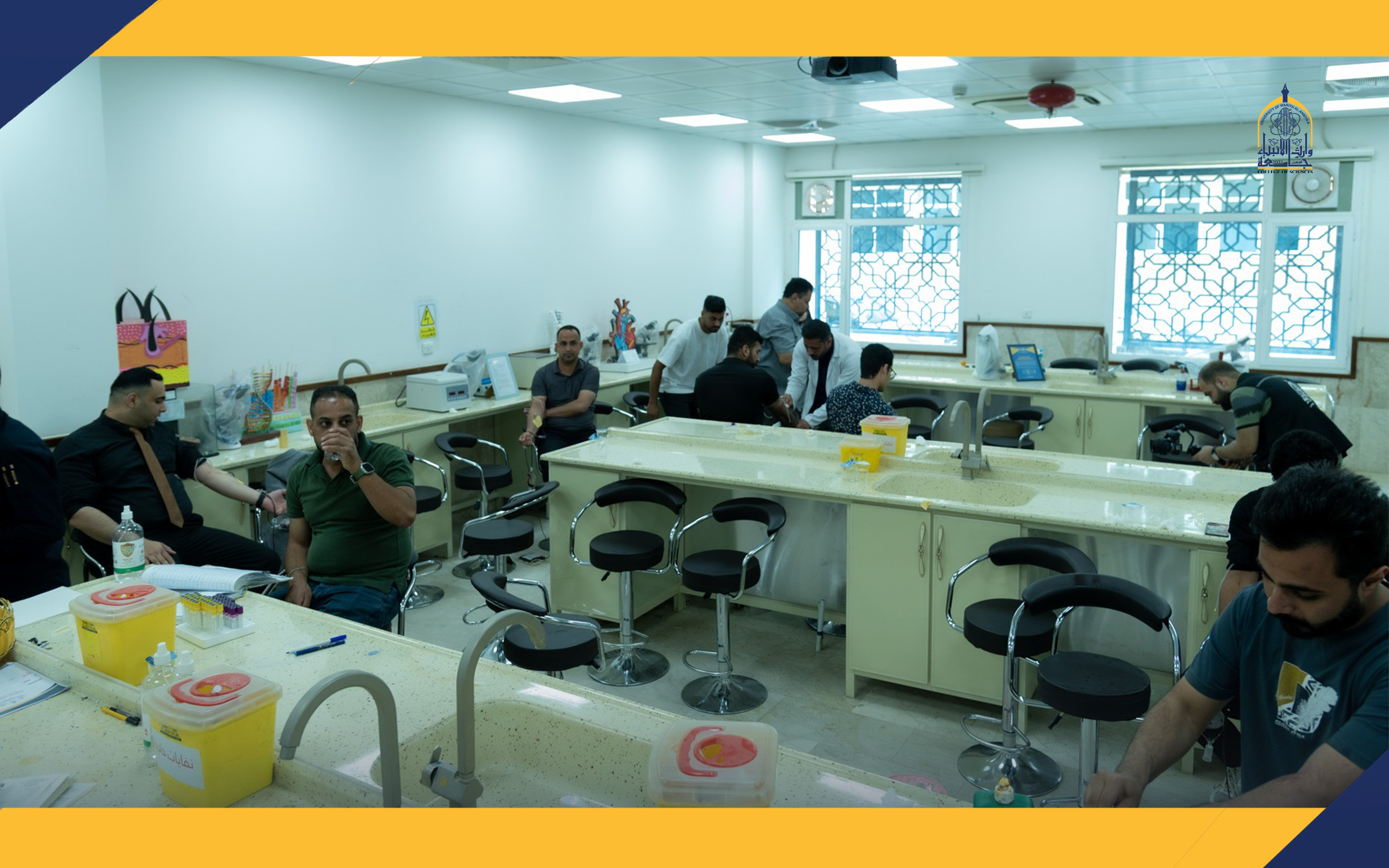 The College of Sciences at the University of Warith Al-Anbiyaa (peace be upon him), in collaboration with the Karbala Health Department / Blood Bank, organized an exceptional humanitarian campaign for blood donation. The campaign witnessed extensive participation from the faculty members and students of the college, emphasizing the values of humanity and community solidarity. Through this noble initiative, the college aims to contribute to saving the lives of patients and those in need of blood, particularly cancer patients and individuals undergoing emergency surgical operations.