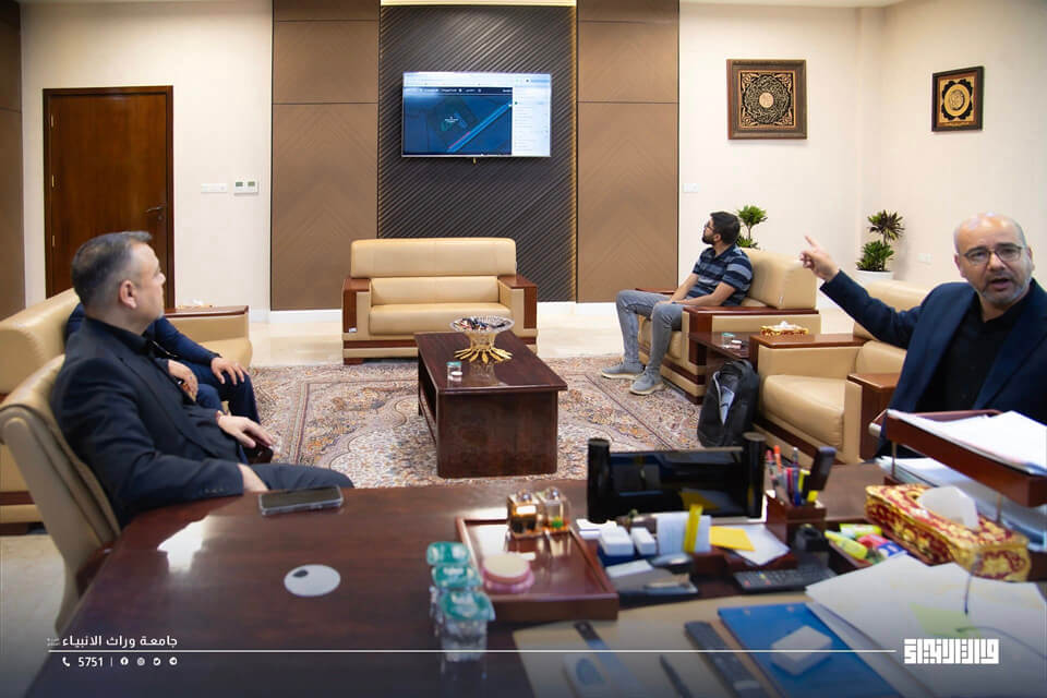 In its ongoing efforts to enhance digital infrastructure and improve safety and emergency response systems, the University of Warith Al-Anbiyaa (PBUH) has launched the first phase of its Civil Defense Early Warning Program. The launch took place during a meeting between the President of the University, Prof. Dr. Ibrahim Saeed Al-Hayawi, the Vice President of Academic Affairs, Prof. Dr. Waqed Al-Moussawi, and a delegation from the Media Department of the Holy Shrine of Imam Hussein (PBUH).
