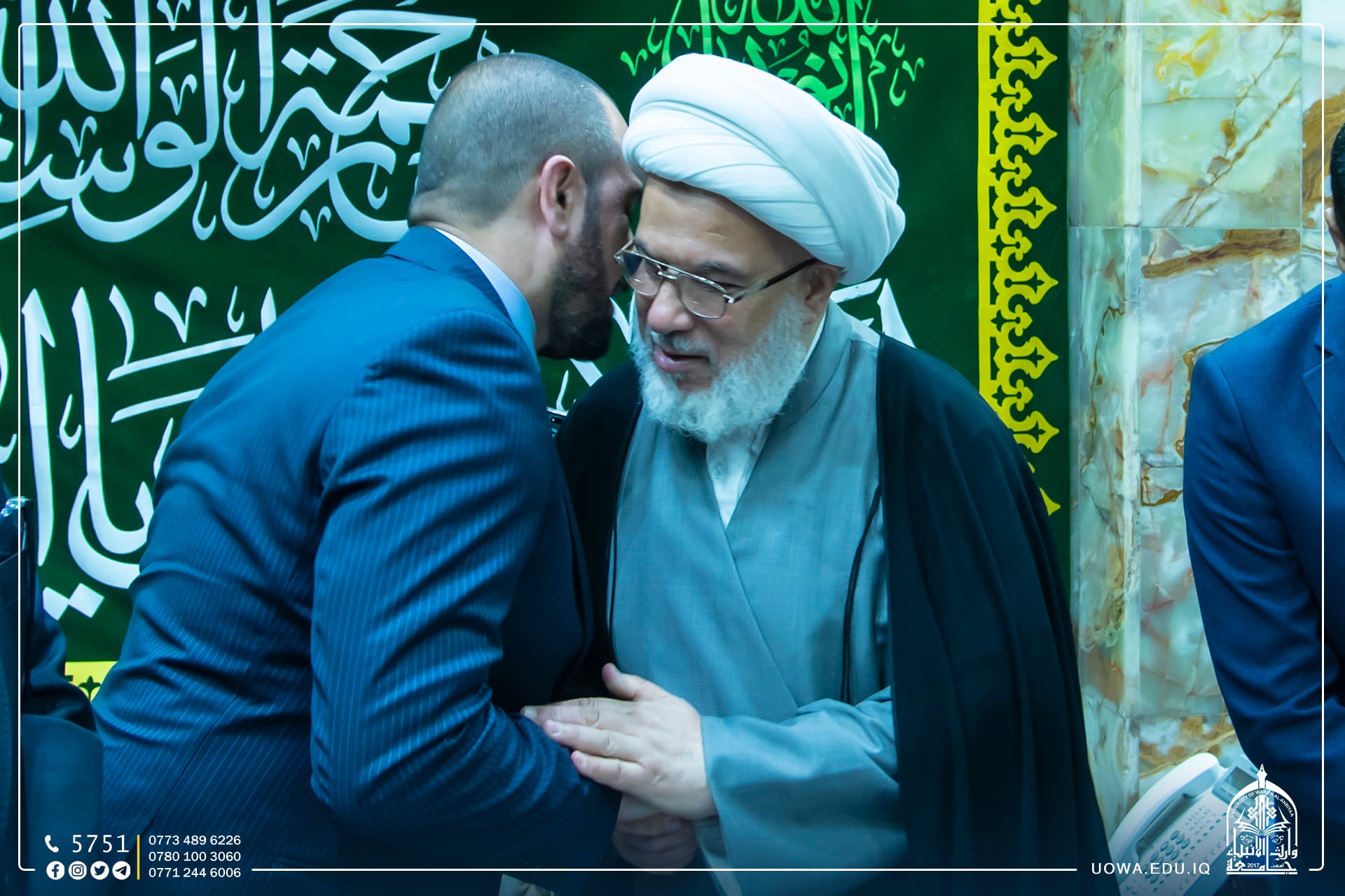 The delegation from the Presidency of the Technological University has the honor of meeting with the legal custodian of the Holy Hussein Shrine, His Eminence Sheikh Abdul Mahdi Al-Karbalai (may his glory endure), on the sidelines of their visit to the