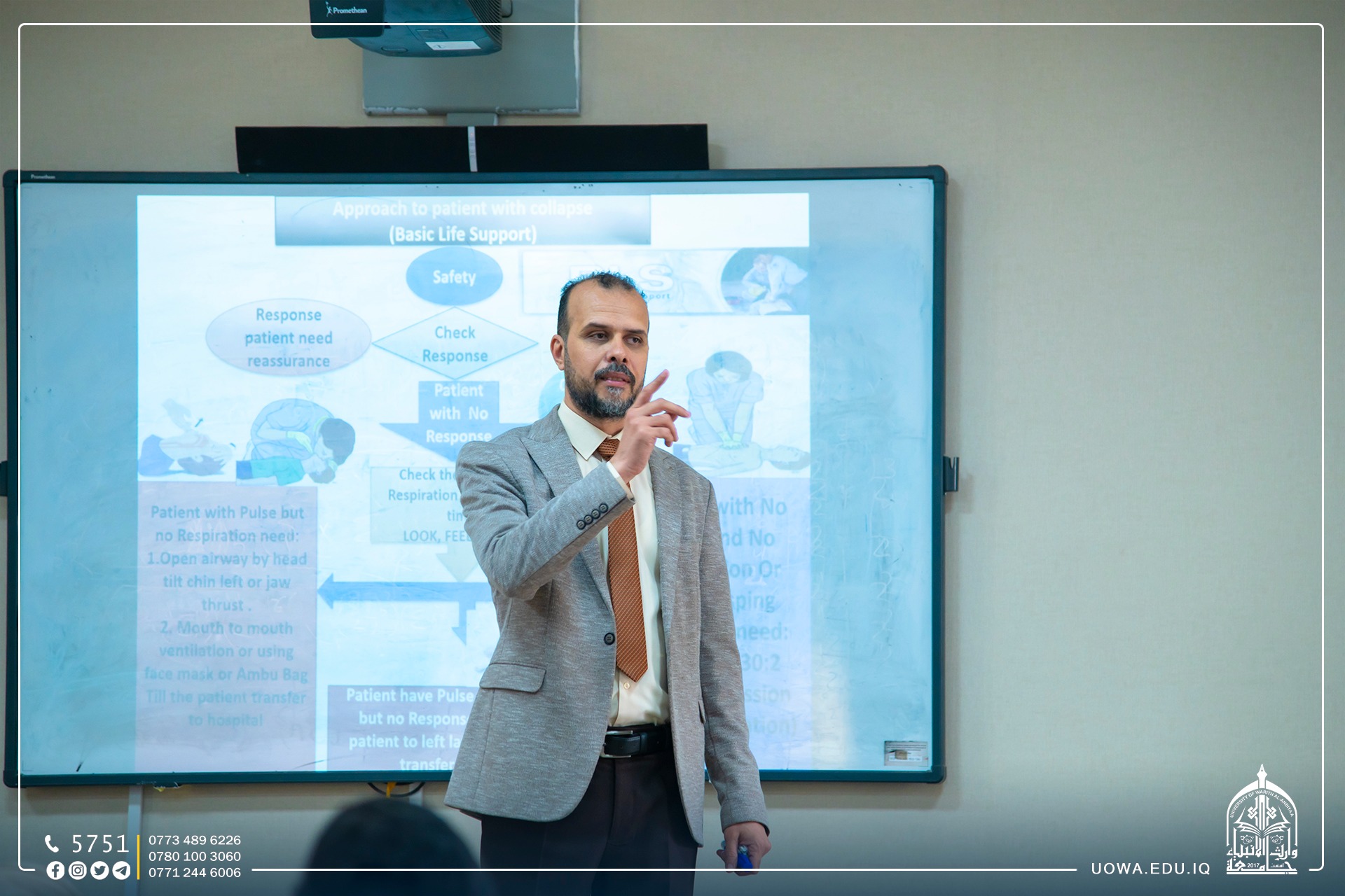 The College of Nursing at the University of Warith Al-Anbiyaa (peace be upon him), in collaboration with the Iraqi Red Crescent Society, Karbala branch, organized a training workshop on "First Aid" for faculty members, staff, and students. The workshop included training participants on how to provide first aid to patients and the injured in emergency situations and accidents. It covered alternative scenarios before transferring the patient to the hospital in the first minutes after the injury.