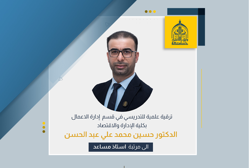 Dr. Hussein Muhammad Kashkul, a lecturer in the Department of Business Administration at the College of Management and Economics at Warith Al-Anbiyaa University (PBUH), received an academic promotion to the rank of assistant professor.