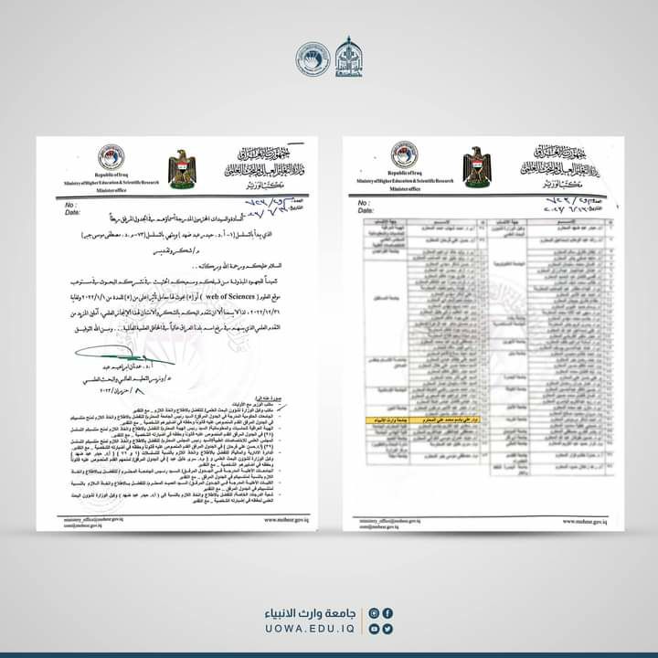 The Minister of Higher Education and Scientific Research presented a “letter of thanks and appreciation” to distinguished researchers for their valuable efforts and tireless efforts to publish scientific research on the Web of Sciences website within research that has an impact factor higher than (5), including the head of the Air Conditioning and Refrigeration Technology Engineering Department at the University of Heir to the Prophets (peace be upon him), teacher Dr. Ali Bassem.This honor came in appreciation of these efforts and expressed his thanks and gratitude for this scientific achievement, hoping for more scientific progress that would contribute to raising the country’s name in international scientific forums.