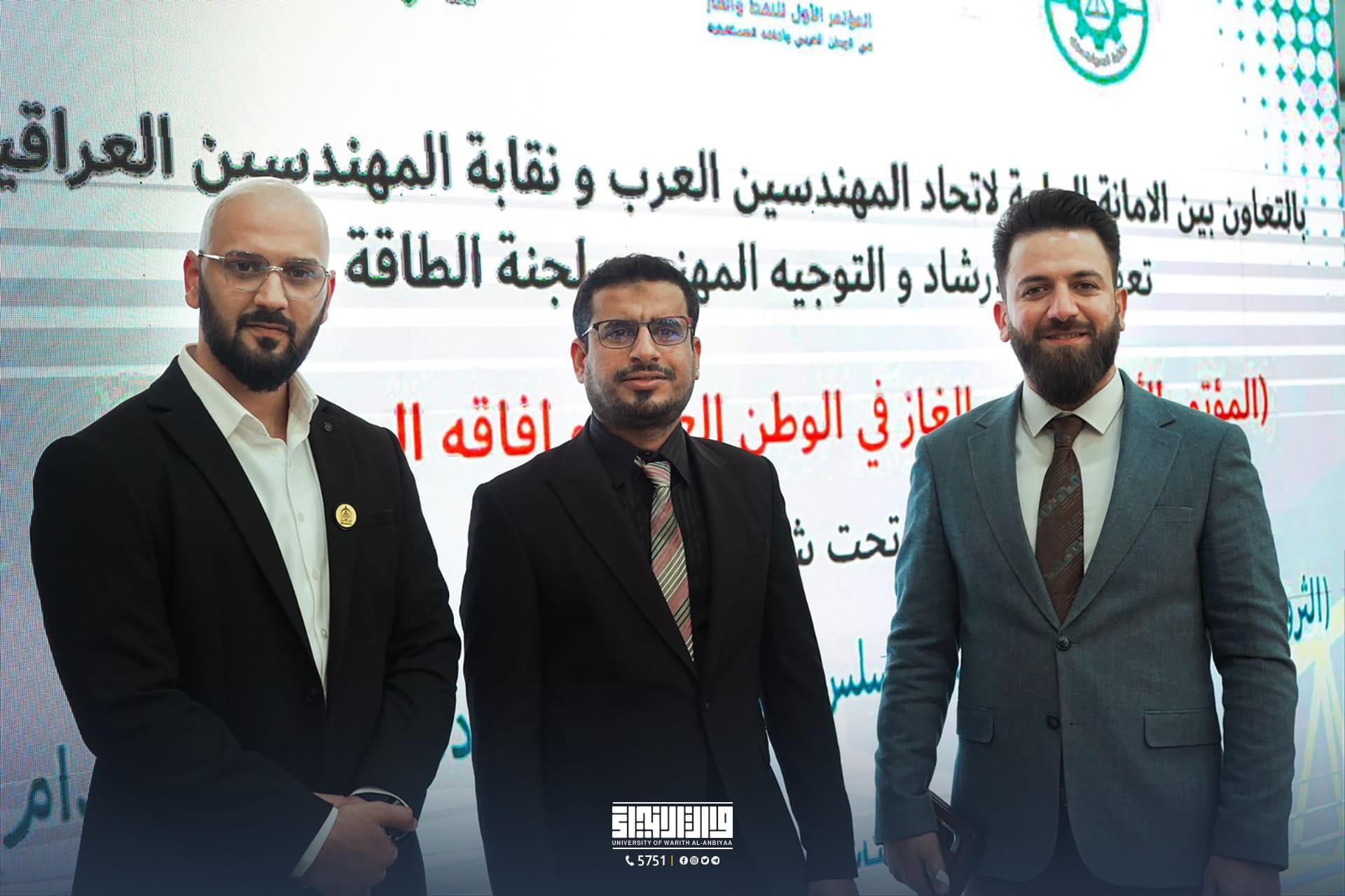 The Department of Oil and Gas Engineering from Warith al-Anbiya University (peace be upon him) actively took part in the inaugural conference on oil and gas in the Arab world and its future outlook. Led by Dr. Deyaa Khafif Khashan, the Head of the Department, and accompanied by several faculty members, a delegation from the College of Engineering represented the university at "The First Conference on Oil and Gas in the Arab World and Its Future Prospects." This conference was organized jointly by the Iraqi Engineers Syndicate and the Arab Engineers Union.