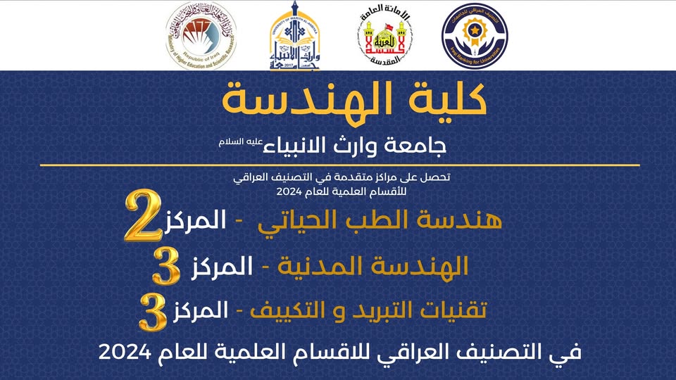 The departments of the College of Engineering at Warith Al-Anbiyaa University (peace be upon him) have achieved an outstanding achievement in the Iraqi rankings of private universities and colleges announced by the Ministry of Higher Education and Scientific Research.The results were as follows: