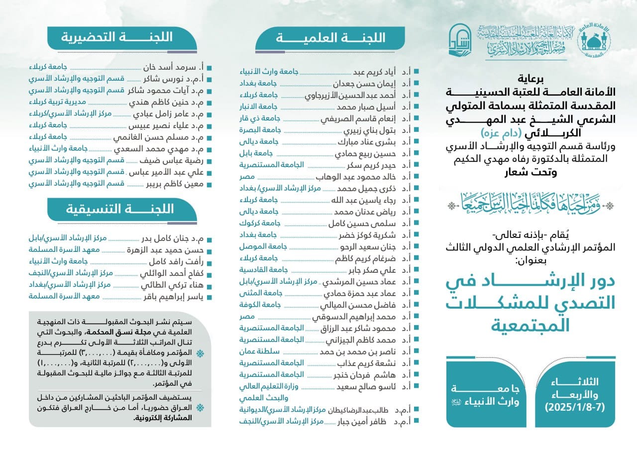 Under the patronage and blessing of the General Secretariat of the Holy Shrine of Imam Hussain (peace be upon him), and under the supervision of His Eminence the Legal Custodian Sheikh Abdul Mahdi Al-Karbala'i (may his glory last), the Family Guidance and Counseling Department announces the holding of its Third International Scientific Guidance Conference entitled: