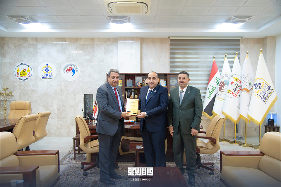 A group from the Deanship of the College of Islamic Sciences at Warith Al-Anbiyaa University, comprising Dr. Nour Al-Saadi, Dr. Ali Ahmed Nasser, and Assistant Professor Dr. Talal Faiq Al-Kamali, the College's Dean, paid a visit to the "House of Wisdom" headquarters in Baghdad. A member of the House of Wisdom's Board of Trustees, Professor Dr. Abdel-Baqi Al-Khazraji, received them.
