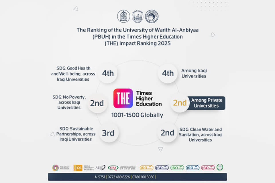 The University of Warith Al-Anbiyaa (PBUH) has made notable progress in the 2025 Times Higher Education (THE) Impact Rankings, securing the second position among private universities in Iraq. This accomplishment reaffirms the university’s advanced academic standing and its continued development across various educational and research domains.